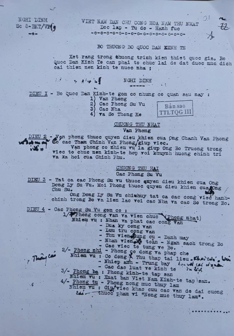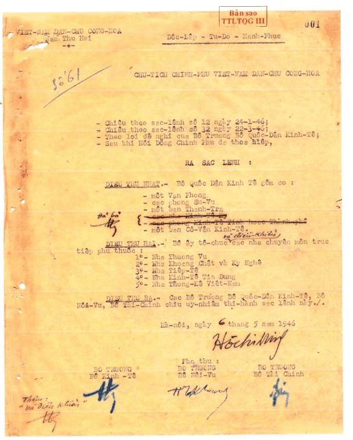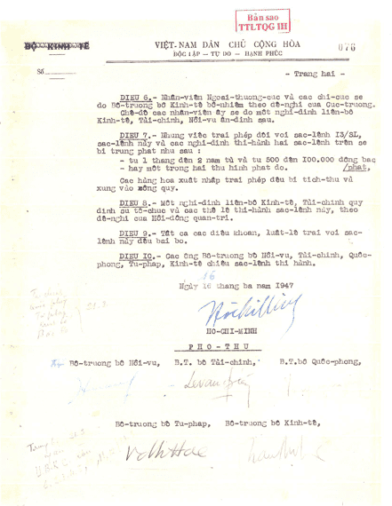 - Sắc lệnh số 29 - B/SL ngày 16 tháng 3 năm 1947 đặt trong Bộ Kinh tế một cơ quan Trung ương điều khiển ngoại thương gọi là "Ngoại thương cục". Ngoại thương cục có một Hội đồng quản trị gồm bốn đại biểu chính thức và bốn đại biểu dự khuyết của bốn bộ Kinh tế, Tài chính, Quốc phòng, Nội vụ.