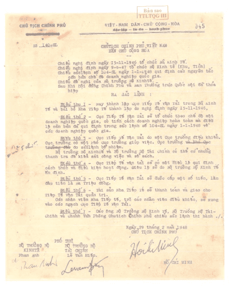 - Sắc lệnh số 140/SL ngày 29/02/1948 của Chủ tịch Chính phủ Việt Nam Dân chủ Cộng hòa thành lập Cục Tiếp tế vận tải trong Bộ Kinh tế.