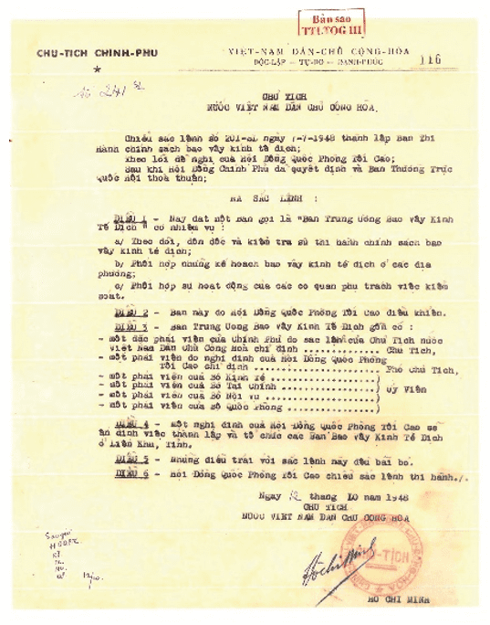 - Sắc lệnh số 241/SL ngày 12/10/1948 của Chủ tịch nước Việt Nam Dân chủ Cộng hòa thành lập Ban Trung ương Bao vây kinh tế địch.