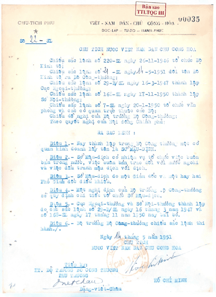 - Sắc lệnh số 22/SL ngày 14 tháng 5 năm 1951 của Chủ tịch nước Việt Nam Dân chủ Cộng hòa về việc thành lập Sở Mậu dịch trong Bộ Công Thương; bãi bỏ Cục Ngoại thương và Sở Nội thương.