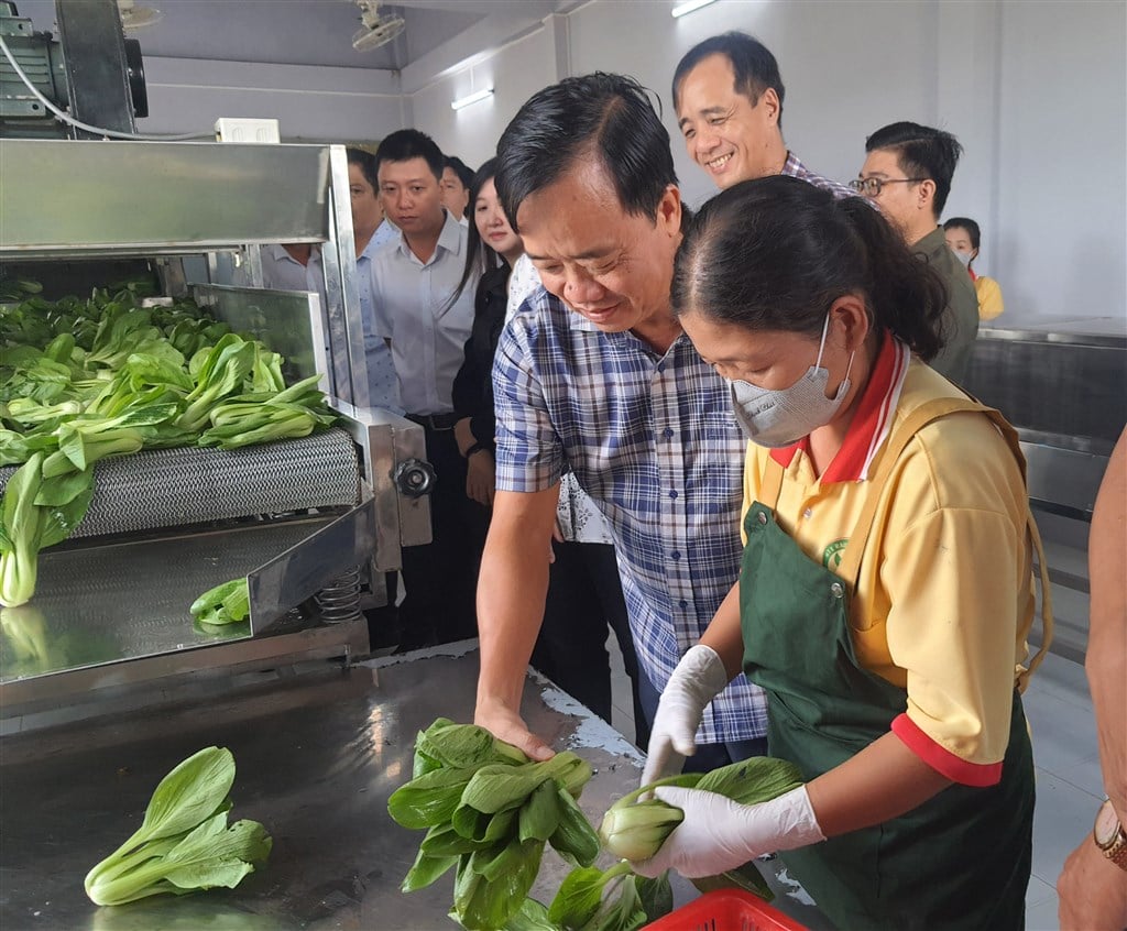 Đồng chí Huỳnh Quốc Việt - Phó Bí thư Thường trực Tỉnh ủy tham quan quy trình xử lý đóng gói rau sạch tại Hợp tác xã rau sạch Đoàn Kết.