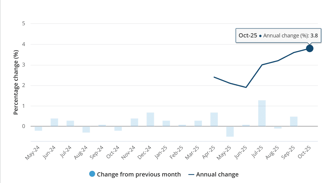 Lạm phát tại Úc có dấu hiệu tiếp tục tăng khi cơ quan Thống kê Úc (ABS) mới công bố số liệu Chỉ số giá tiêu dùng (CPI) đo lường tháng 10/2025 ghi nhận ở mức 3,8% (tháng trước là 3,6%). Như vậy, tình hình lạm phát tại Úc đang có nóng trở lại trong những tháng gần đây, tác động tới chi tiêu hộ gia đình cũng như chính sách tiền tệ của ngân hàng trung ương.