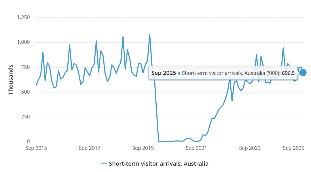 Theo cơ quan Thống kê Úc (ABS), tổng lượt khách từ nước ngoài đến Úc tháng 9/2025 đạt gần 1,83 triệu lượt, tăng 5,6% so với cùng kỳ 2024. Trong số này, công dân Úc trở về nước trong ngắn hạn là 1,05 triệu lượt (+2,9%); khách quốc tế đến Úc trong ngắn hạn là 696,5 nghìn lượt (+10,4%), số lượng cao hơn 0,2% so với giai đoạn trước đại dịch Covid-19 (tháng 9/2019 ghi nhận 694 nghìn lượt).