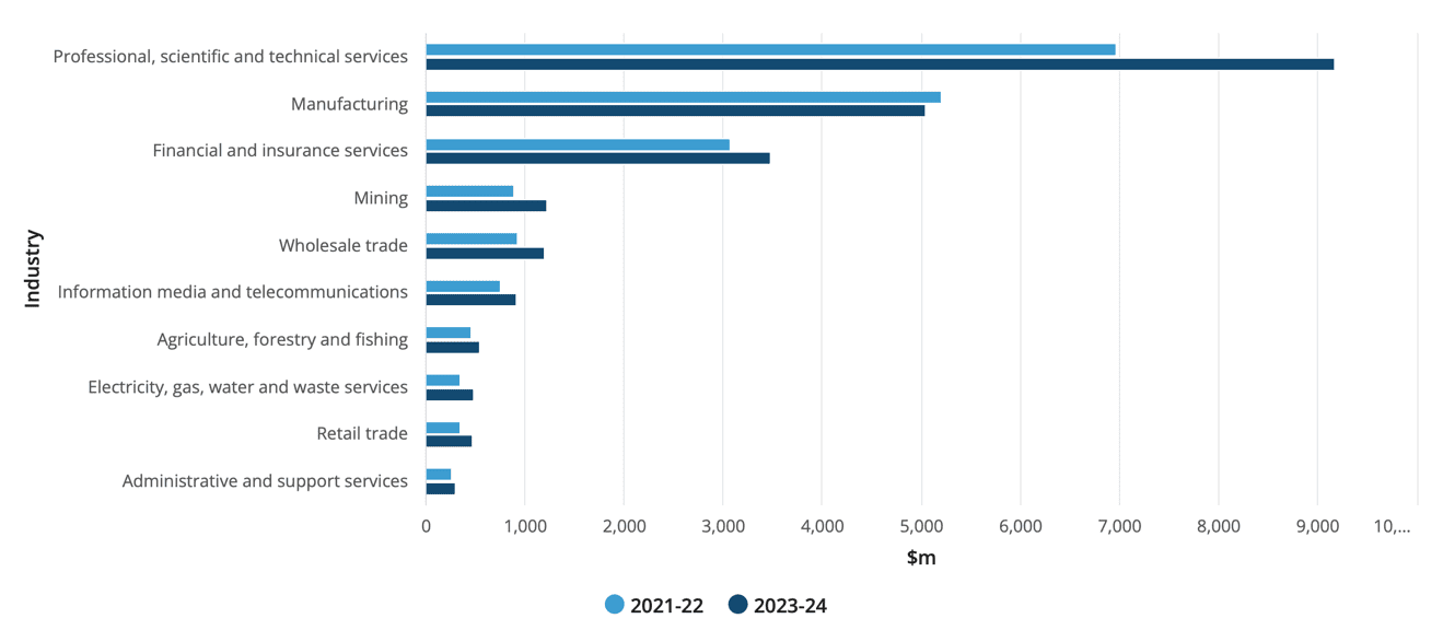 Trong 10 lĩnh vực có đầu tư lớn nhất cho R&D, khoa học kỹ thuật và dịch vụ chuyên nghiệp đứng đầu (9,2 tỷ AUD, chiếm 38% đầu tư cho R&D trong năm 2023-24), tiếp đến là sản xuất (hơn 5 tỷ AUD), lĩnh vực dịch vụ tài chính và bảo hiểm đứng thứ 3 (khoảng 3,5 tỷ AUD)…