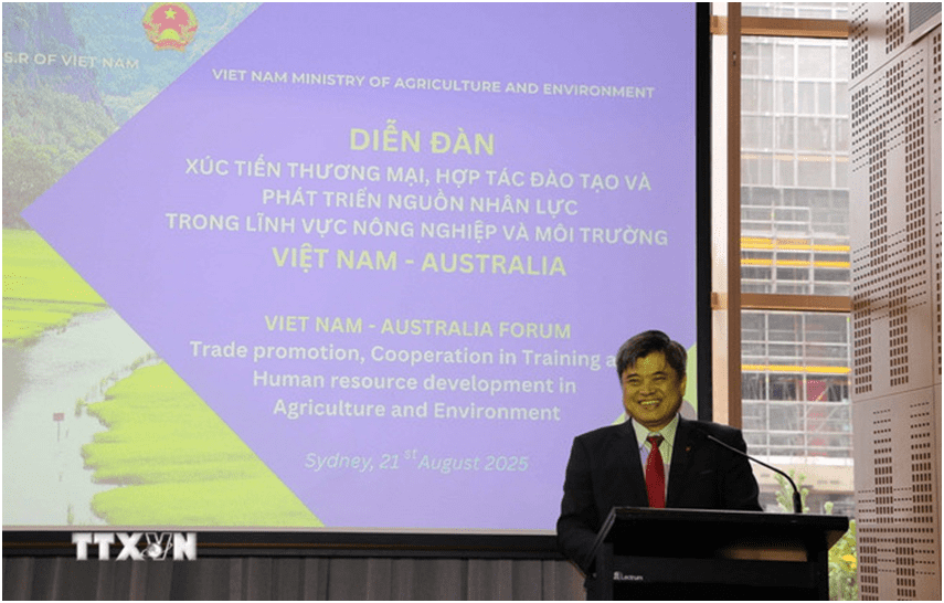 Trong khuôn khổ chuyến thăm và làm việc tại Úc của Đoàn công tác Bộ Nông nghiệp và Môi trường Việt Nam do Thứ trưởng Trần Thanh Nam dẫn đầu, ngày 21/8, Bộ Nông nghiệp và Môi trường Việt Nam đã phối hợp với Tổng Lãnh sự quán Việt Nam tại Sydney tổ chức “Diễn đàn Việt Nam-Australia về xúc tiến thương mại, hợp tác đào tạo và phát triển nguồn nhân lực trong lĩnh vực nông nghiệp và môi trường”.