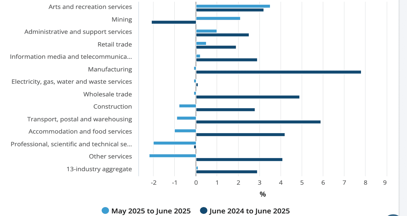 Tăng trưởng doanh số kinh doanh trung bình 13 lĩnh vực ngành nghề kinh tế chủ chốt của Úc trong tháng 6/2025 tăng nhẹ 0,1% so với tháng trước nhờ vào sự tăng trưởng của 5/13 lĩnh vực, trong đó các lĩnh vực ghi nhận mức tăng tích cực gồm: Dịch vụ nghệ thuật và giải trí (+3,5%), Khai khoáng (+2,1%), Dịch vụ hành chính và hỗ trợ (+1,1%).