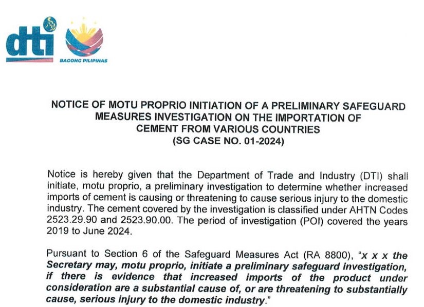 Thông báo của Bộ Công Thương Philippines về khởi xướng điều tra sơ bộ theo biện pháp tự vệ đối với xi măng nhập khẩu từ một số nước