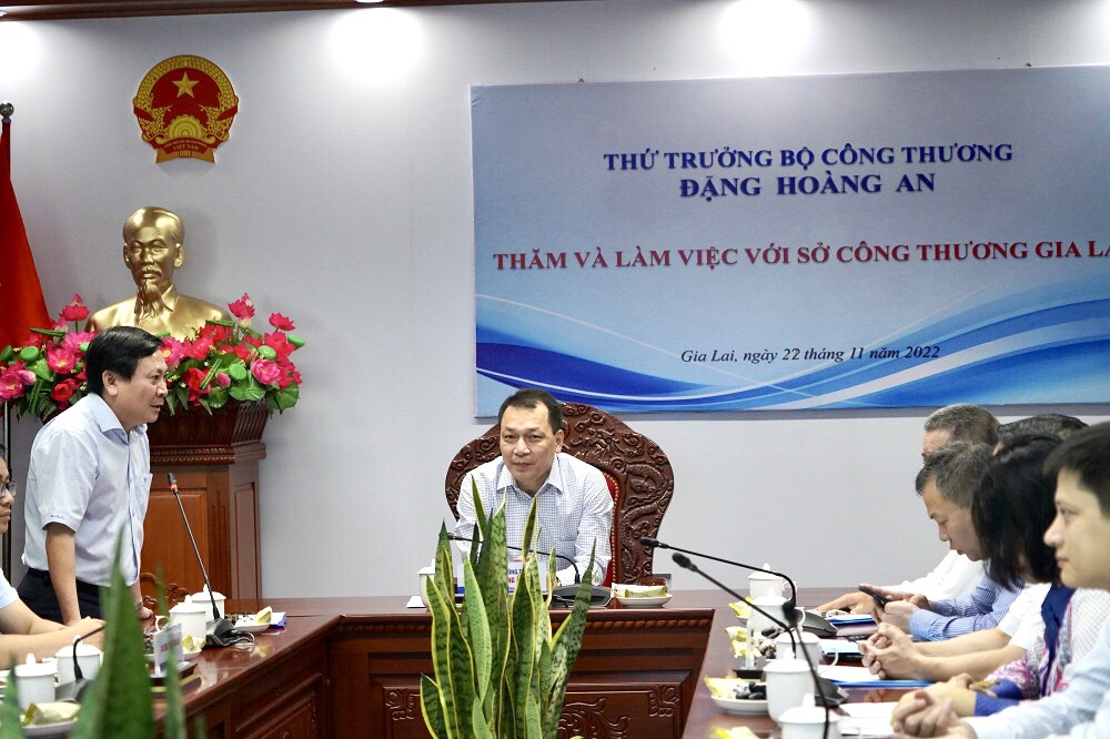 Phát biểu tại buổi làm việc, Thứ trưởng Bộ Công Thương Đặng Hoàng An ghi nhận ngành Công Thương Gia Lai năm 2022 đã có kết quả tích cực trong lĩnh vực công nghiệp, xuất khẩu, điều hành thị trường trong nước. Với tiềm năng lợi thế sẵn có, Gia Lai đã ưu tiên thu hút, phát triển các nhà máy chế biến sản phẩm từ nông nghiệp, lĩnh vực năng lượng.