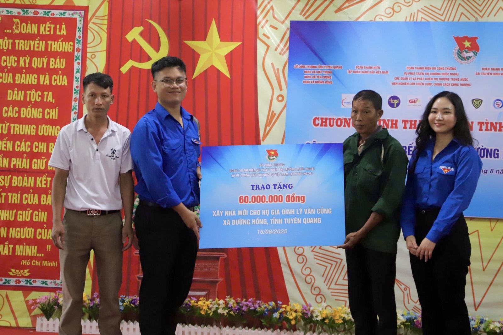 Trong 2 ngày 16 và 17/8/2025, Ban Thường vụ Đoàn Bộ Công Thương cùng Đoàn Thanh niên Vụ Phát triển Thị trường nước ngoài, Cục Quản lý và Phát triển thị trường trong nước, Viện Nghiên cứu Chiến lược, Chính sách Công Thương phối hợp với Đoàn Thanh niên Ban Chính sách Chiến lược Trung ương, Đài Truyền hình Việt Nam, Tập đoàn Xăng dầu Việt Nam và các đơn vị địa phương tổ chức chương trình Thanh niên tình nguyện “Chung tay xóa nhà tạm, nhà dột nát trên phạm vi cả nước trong năm 2025” tại xã Giáp Trung, Yên Cường, Đường Hồng tỉnh Tuyên Quang.