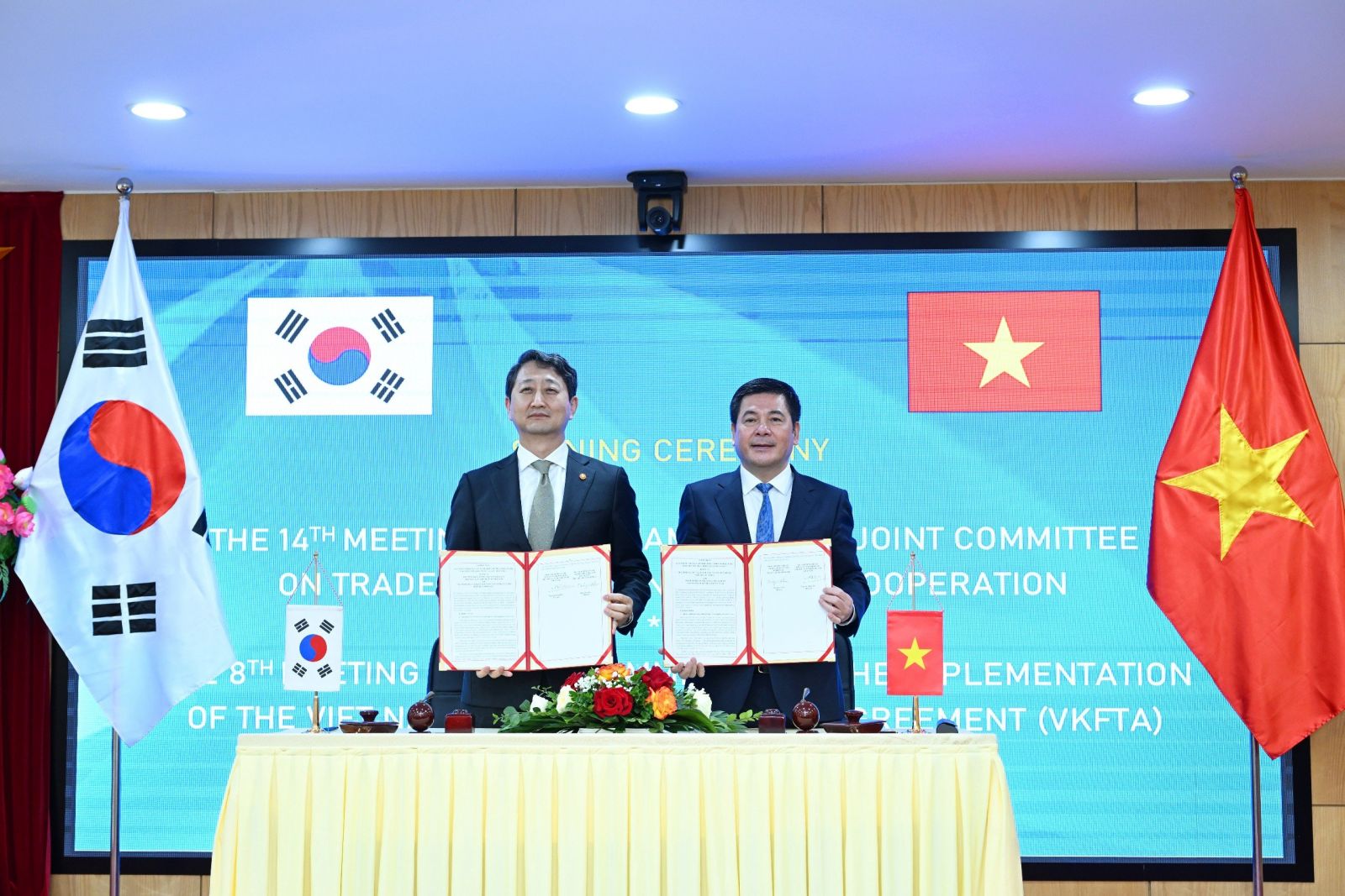 Kết thúc hai kỳ họp, hai Bộ trưởng đã cùng ký kết 3 văn kiện bao gồm: Biên bản kỳ họp lần thứ 14 Ủy ban hỗn hợp về hợp tác thương mại, công nghiệp và năng lượng Việt Nam - Hàn Quốc; Tuyên bố chung của Kỳ họp lần thứ 8 Ủy ban thực thi Hiệp định Thương mại tự do Việt Nam - Hàn Quốc; Kế hoạch hành động thực hiện mục tiêu kim ngạch thương mại song phương 150 tỷ USD theo hướng cân bằng hơn.