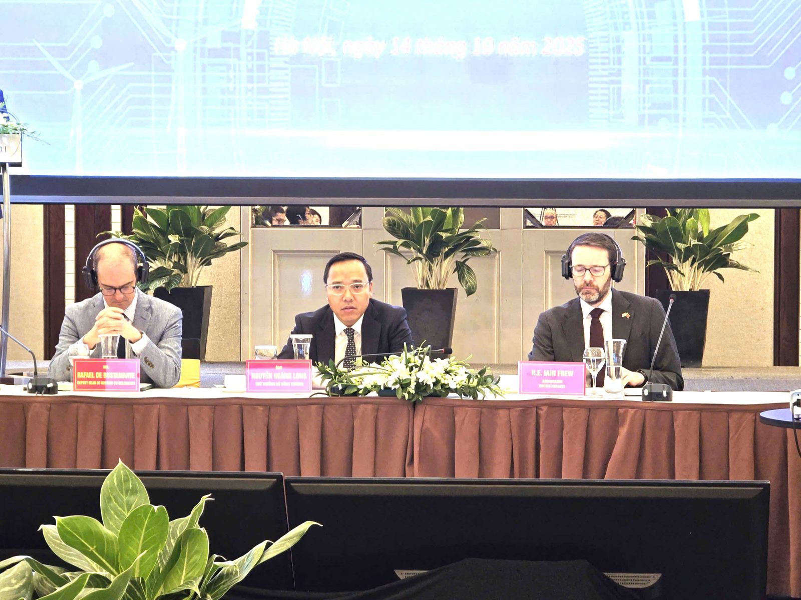 Thứ trưởng Bộ Công Thương Nguyễn Hoàng Long cùng Ngài Iain Frew Đại sứ Anh quốc tại Hà Nội, và Ngài Rafael de Bustamante Phó trưởng Phái đoàn Liên minh châu Âu tại Việt Nam đồng chủ trì cuộc họp