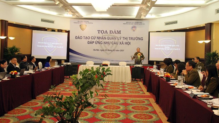 Trường Đại học Kinh tế quốc dân đã phối hợp với Tổng cục Quản lý thị trường dự thảo chương trình và giáo trình đào tạo chính quy bậc Đại học chuyên ngành Quản lý thị trường. Toạ đàm được tổ chức hôm nay đã nhận được nhiều ý kiến đóng góp để bổ sung, hoàn thiện nhu cầu đào tạo, yêu cầu nghề nghiệp, chương trình đào tạo… từ đó, hoàn thiện khung chương trình đào tạo cũng như chuẩn đầu ra, đáp ứng được nhu cầu xã hội đối với các cử nhân ngành Quản lý thị trường trong tương lai.