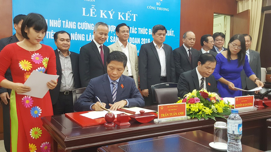 Trước bối cảnh nêu trên, để phát huy vai trò quản lý nhà nước của hai Bộ trong thời gian tới và tăng cường hơn nữa sự phối hợp đồng bộ giữa các đơn vị trực thuộc trong công tác triển khai thực hiện các giải pháp thúc đẩy sản xuất, tiêu thụ nông lâm thủy sản theo hướng nâng cao chất lượng và giá trị gia tăng trong khuôn khổ Đề án tái cơ cấu ngành nông nghiệp, trong đó tập trung nhấn mạnh vào công tác trao đổi thông tin, tháo gỡ rào cản phi thuế quan và mở cửa thị trường, đặc biệt trong bối cảnh hội nhập kinh tế quốc tế sâu và rộng như hiện nay, đảm bảo công tác chỉ đạo, điều hành của hai Bộ được thông suốt, hiệu lực, hiệu quả, Bộ trưởng Bộ Công Thương Trần Tuấn Anh và Bộ Trưởng Bộ Nông nghiệp và Phát triển nông thôn Nguyễn Xuân Cường đã thống nhất ký kết Bản ghi nhớ về tăng cường phối hợp công tác giữa hai Bộ để thúc đẩy sản xuất, tiêu thụ nông lâm thủy sản giai đoạn 2016 - 2020, kèm theo là Bản Kế hoạch triển khai một số nội dung về đàm phán tháo gỡ rào cản, mở cửa thị trường mà hai Bộ cần tập trung phối hợp thực hiện trong 2 tháng cuối năm 2016 và 6 tháng đầu năm 2017.