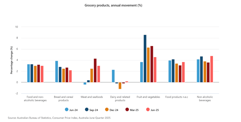 (Ảnh: Biểu đồ minh hoạ thay đổi giá thực phẩm, đồ uống tại Úc theo quý)