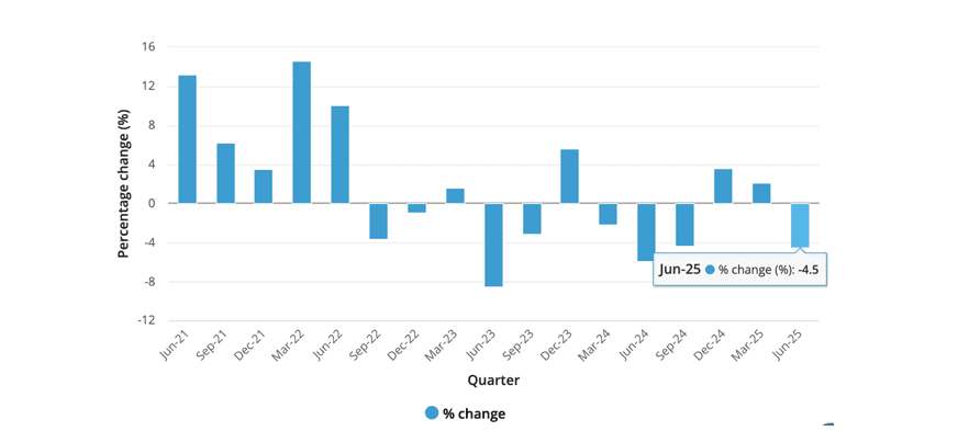 Theo số liệu từ Cơ quan thống kê Úc (ABS), chỉ số giá xuất khẩu (Export Price Index – EPI) của Úc trong quý 2/2025 giảm 4,5% so với quý 1/2025 và giảm 3,3% so với cùng kỳ 2024.