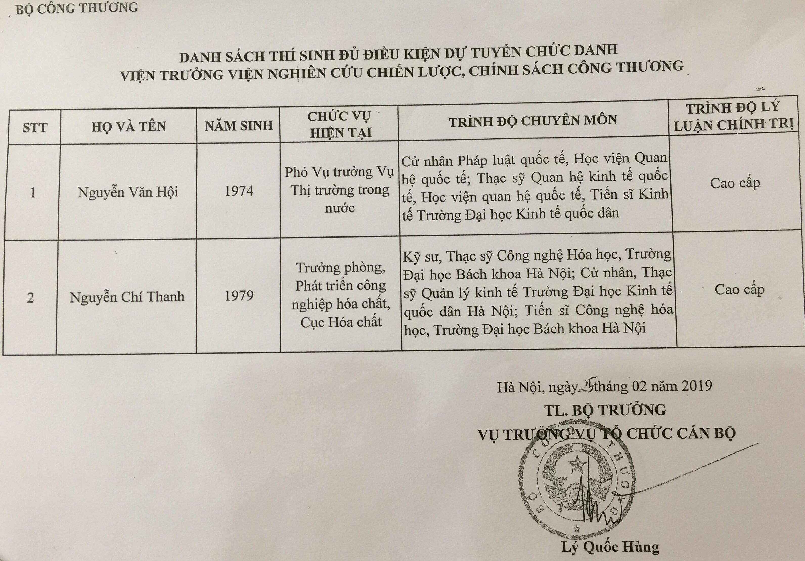 Sau khi đăng thông báo thi tuyển trên Cổng thông tin điện tử Bộ Công Thương và một số đơn vị báo chí; đồng thời gửi thông báo đến các Bộ, cơ quan ngang Bộ, UBND các tỉnh, thành phố về việc thi tuyển chức danh Viện trưởng Viện Nghiên cứu Chiến lược, chính sách Công Thương, đến ngày 31/01/2019, có 02 ứng viên đủ tiêu chuẩn, điều kiện tham gia thi tuyển là: ông Nguyễn Văn Hội, Phó Vụ trưởng Vụ Thị trường trong nước và ông Nguyễn Chí Thanh - Trưởng phòng Phát triển công nghiệp hoá chất, Cục Hoá chất.