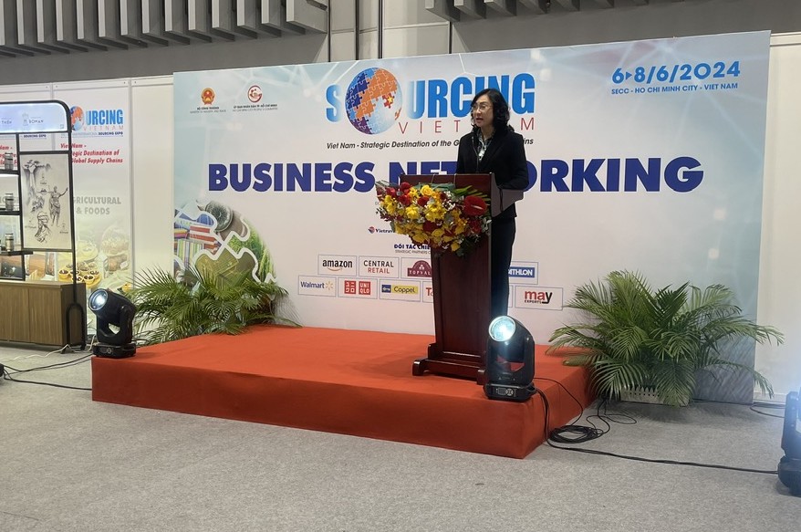 Thứ trưởng Bộ Công Thương Phan Thị Thắng phát biểu chào đón đại diện các đoàn mua hàng, các doanh nghiệp tại sự kiện Kết nối chuỗi cung ứng quốc tế năm 2024