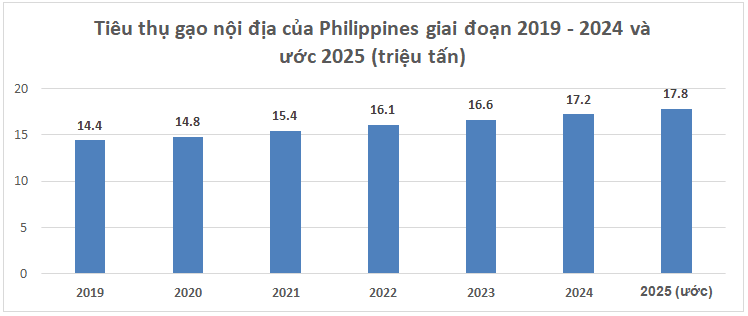 Nhu cầu tiêu thụ gạo nội địa của Philippines có xu hướng tăng hàng năm, từ mức dưới 15 triệu tấn năm 2019, đến năm 2024 đã tăng lên 17 triệu tấn. Cụ thể, tổng lượng gạo tiêu tụ nội địa của Philippines trong các năm 2019, 2020, 2021, 2022, 2023 và 2024 lần lượt là 14,4 triệu tấn, 14,8 triệu tấn, 15,4 triệu tấn, 16,1 triệu tấn, 16,6 triệu tấn và 17,2 triệu tấn. Dự báo năm 2025, nhu cầu tiêu thụ gạo nội địa của Philippines khoảng 17,8 triệu tấn.