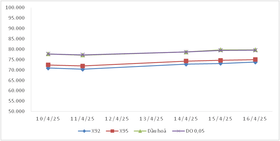 Bình quân giá thành phẩm xăng dầu thế giới giữa kỳ điều hành giá ngày 10/4/2025 và kỳ điều hành ngày 17/4/2025 là: 72,216 USD/thùng xăng RON92 dùng để pha chế xăng E5RON92 (giảm 1,968 USD/thùng, tương đương giảm 2,65%); 73,670 USD/thùng xăng RON95 (giảm 1,664 USD/thùng, tương đương giảm 2,21%); 78,618 USD/thùng dầu hỏa (giảm 1,102 USD/thùng, tương đương giảm 1,38%); 78,520 USD/thùng dầu điêzen 0,05S (giảm 0,964 USD/thùng, tương đương giảm 1,21%); 422.548 USD/tấn dầu mazut 180CST 3,5S (tăng 3,020 USD/tấn, tương đương tăng 0,72%).