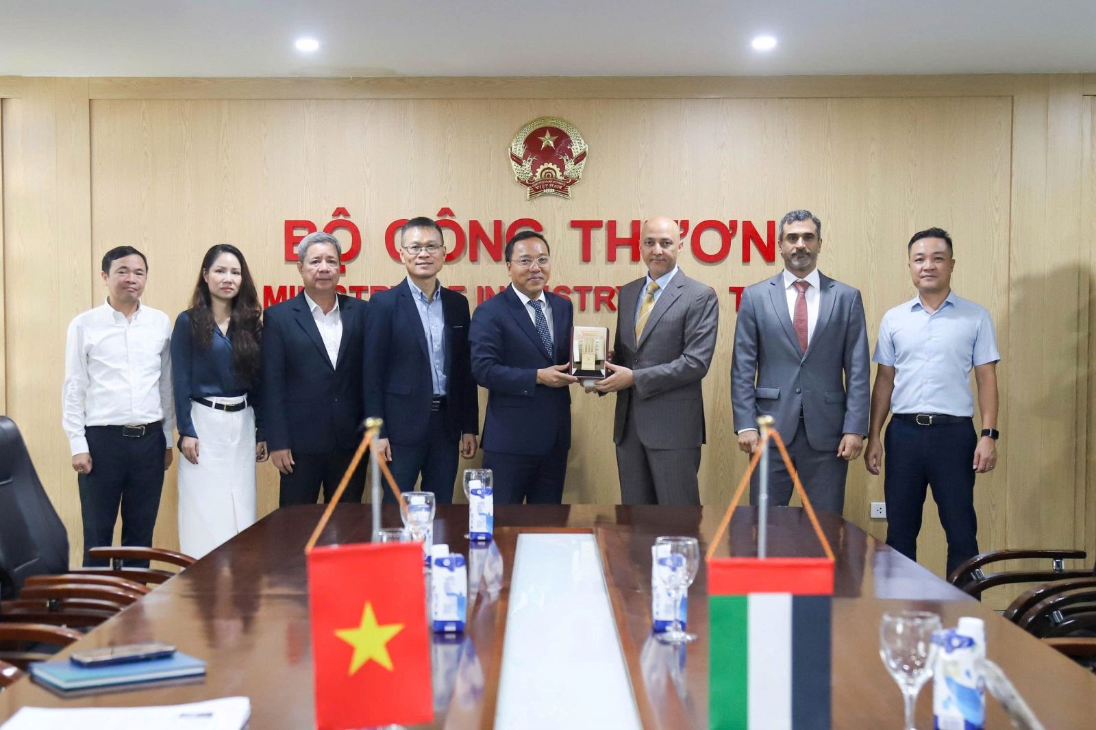 Kết thúc buổi làm việc, Thứ trưởng Nguyễn Hoàng Long thông báo với Đại sứ UAE về việc tháng 9/2025, Bộ Công Thương sẽ tháp tùng Lãnh đạo cấp cao của Việt Nam trong chuyến thăm và làm việc tại UAE với nhiều hoạt động, sự kiện quan trọng. Nhân dịp này, Thứ trưởng đề nghị phía UAE phối hợp với Bộ Công Thương Việt Nam hoàn tất các thủ tục nội bộ để ký kết Bản ghi nhớ (MOU) hợp tác trong lĩnh vực năng lượng xanh và năng lượng tái tạo giữa hai nước. Đồng thời, Thứ trưởng cũng đề nghị Đại sứ quán UAE hỗ trợ thúc đẩy Bộ Kinh tế UAE sớm thống nhất thời gian tổ chức Kỳ họp lần thứ nhất Nhóm công tác chung về thương mại, kinh tế và đầu tư giữa hai nước.