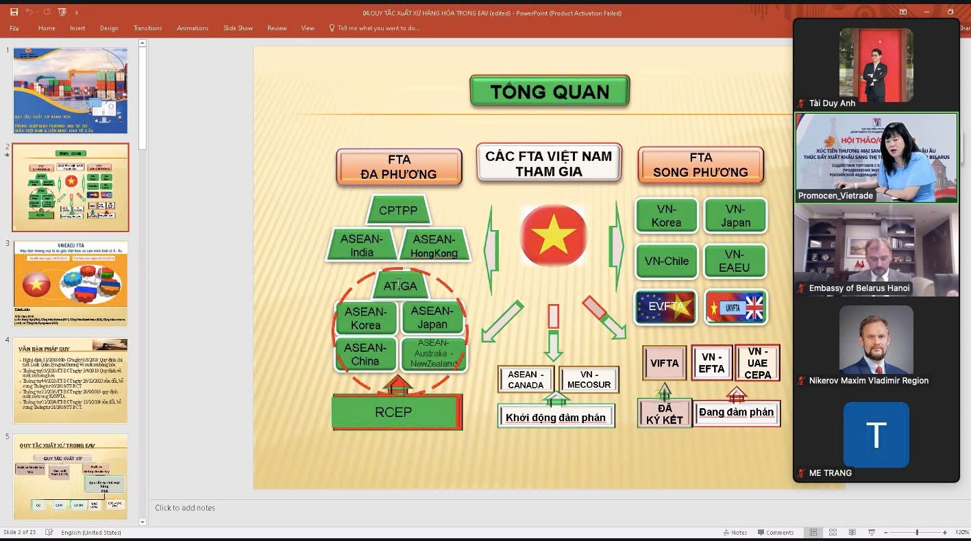 Ngày 24/6/2025, Cục Xúc tiến thương mại (Bộ Công Thương) phối hợp với Vụ Phát triển Thị trường nước ngoài, Thương vụ Việt Nam tại Liên bang Nga, Thương vụ Việt Nam tại CH Belarus tổ chức hội thảo trực tuyến xúc tiến thương mại sang thị trường Châu Âu với chủ đề: Thúc đẩy xuất khẩu sang thị trường Liên bang Nga và Cộng hòa Belarus.