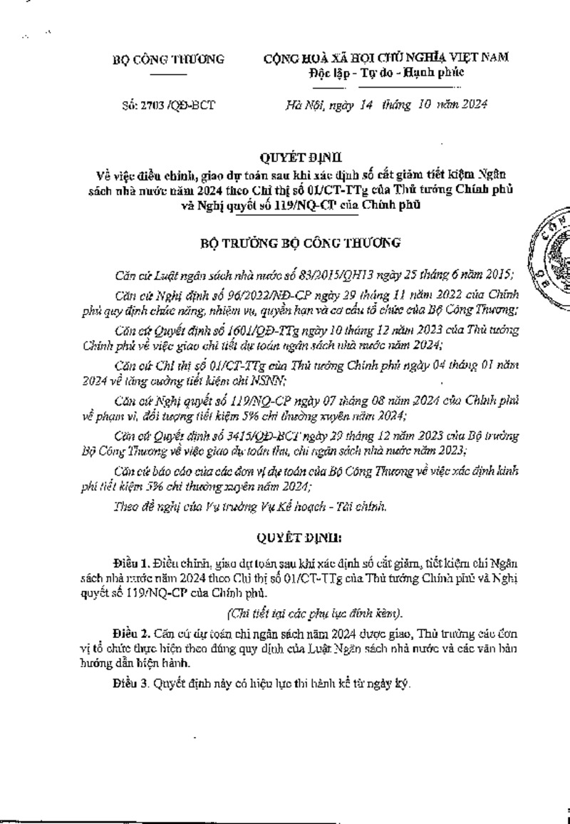 | Số hiệu | 2703/QĐ-BCT | Cơ quan ban hành | Bộ Công Thương |