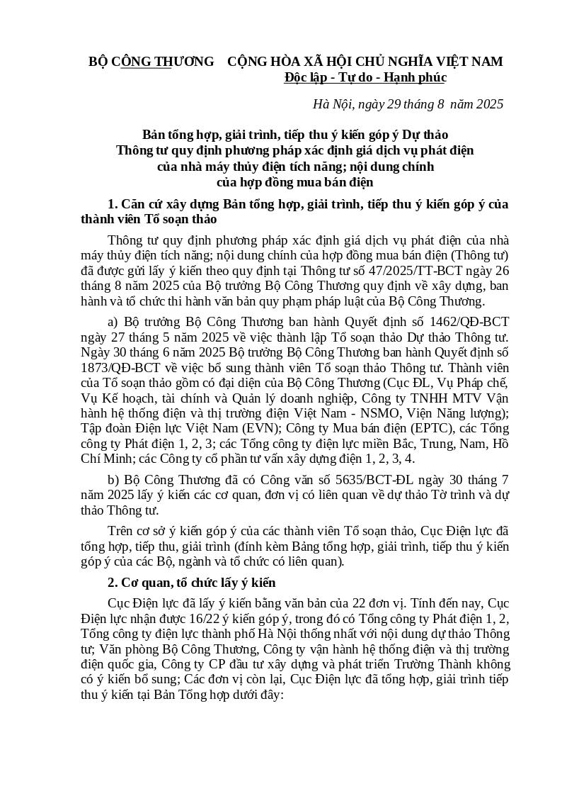 Bản tổng hợp, giải trình, tiếp thu ý kiến góp ý của cơ quan, đơn vị về Dự thảo Thông tư quy định phương pháp xác định giá dịch vụ phát điện của nhà máy thủy điện tích năng; nội dung chính của hợp đồng mua bán điện