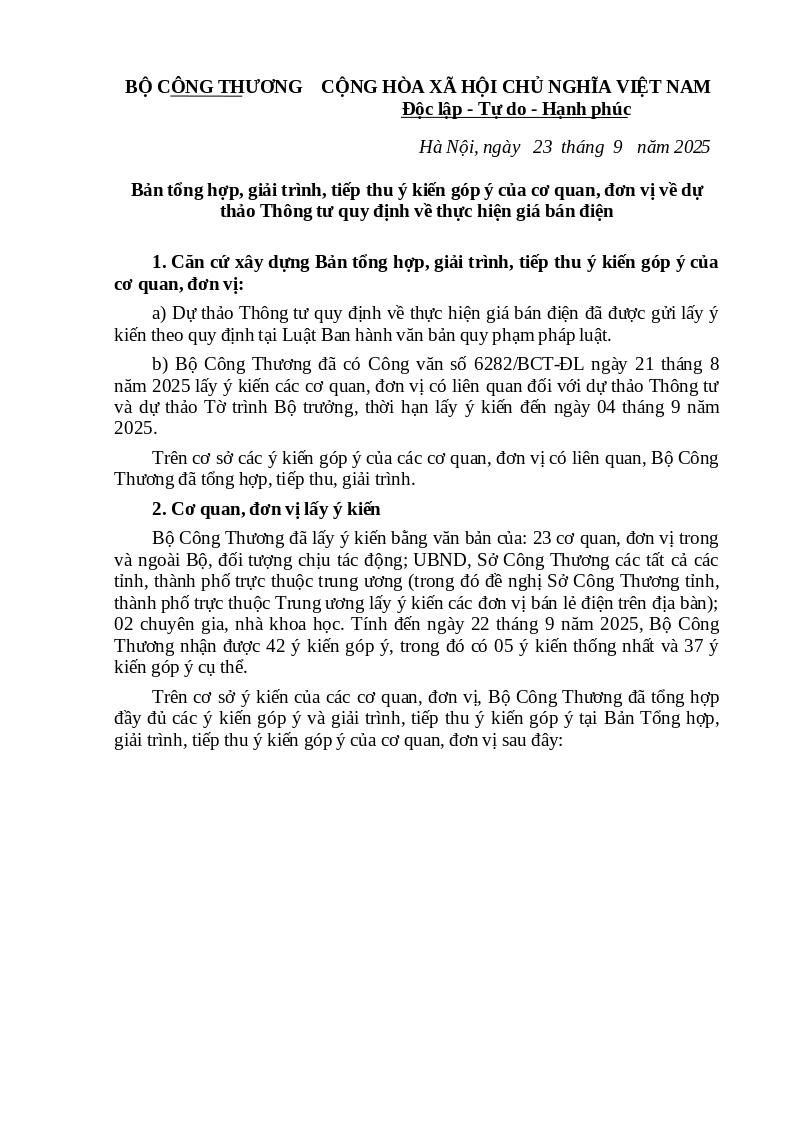 Cục Điện lực đăng tải Bản tổng hợp, giải trình, tiếp thu ý kiến góp ý của cơ quan, đơn vị về dự thảo Thông tư quy định về thực hiện giá bán điện trên.