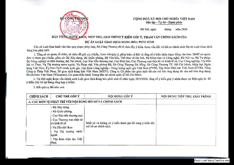 Căn cử Luật Ban hành văn bản quy phạm pháp luật năm 2025, Cục Quản lý và Phát triển thị trường trong nước (Bộ Công Thương) đăng tải bản tổng hợp ý kiến, tiếp thu, giải trình ý kiến góp ý đối với hồ sơ chính sách Luật Giao dịch hàng hóa phái sinh.