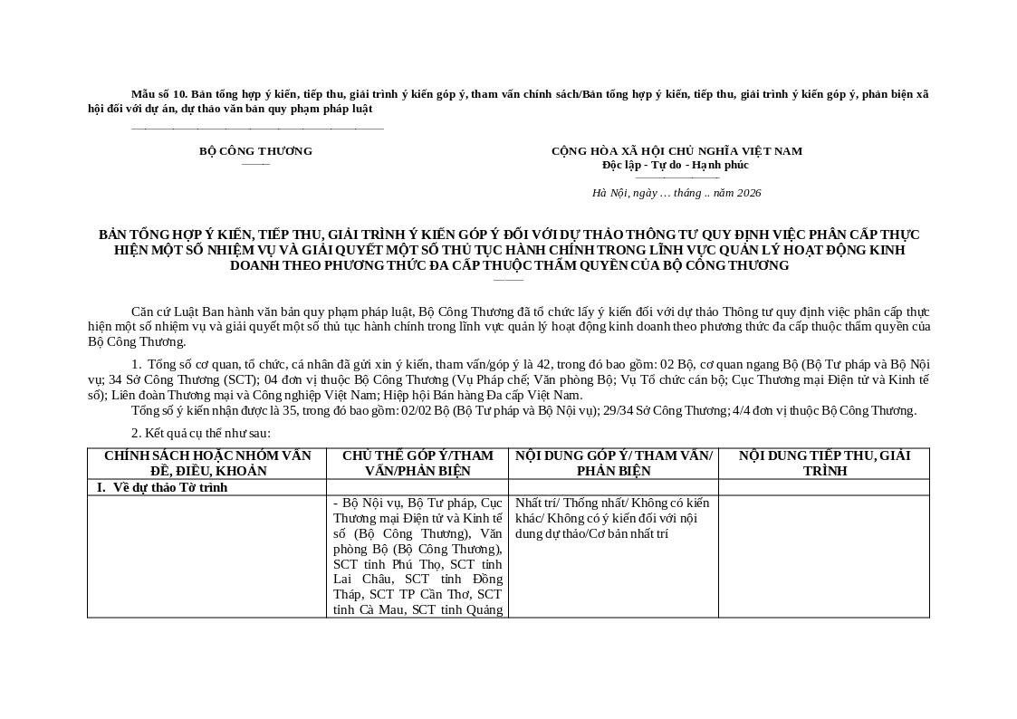 Bản tổng hợp ý kiến, tiếp thu, giải trình ý kiến góp ý đối với hồ sơ dự thảo Thông tư quy định việc phân cấp thực hiện một số nhiệm vụ và giải quyết một số thủ tục hành chính trong lĩnh vực quản lý hoạt động kinh doanh theo phương thức đa cấp