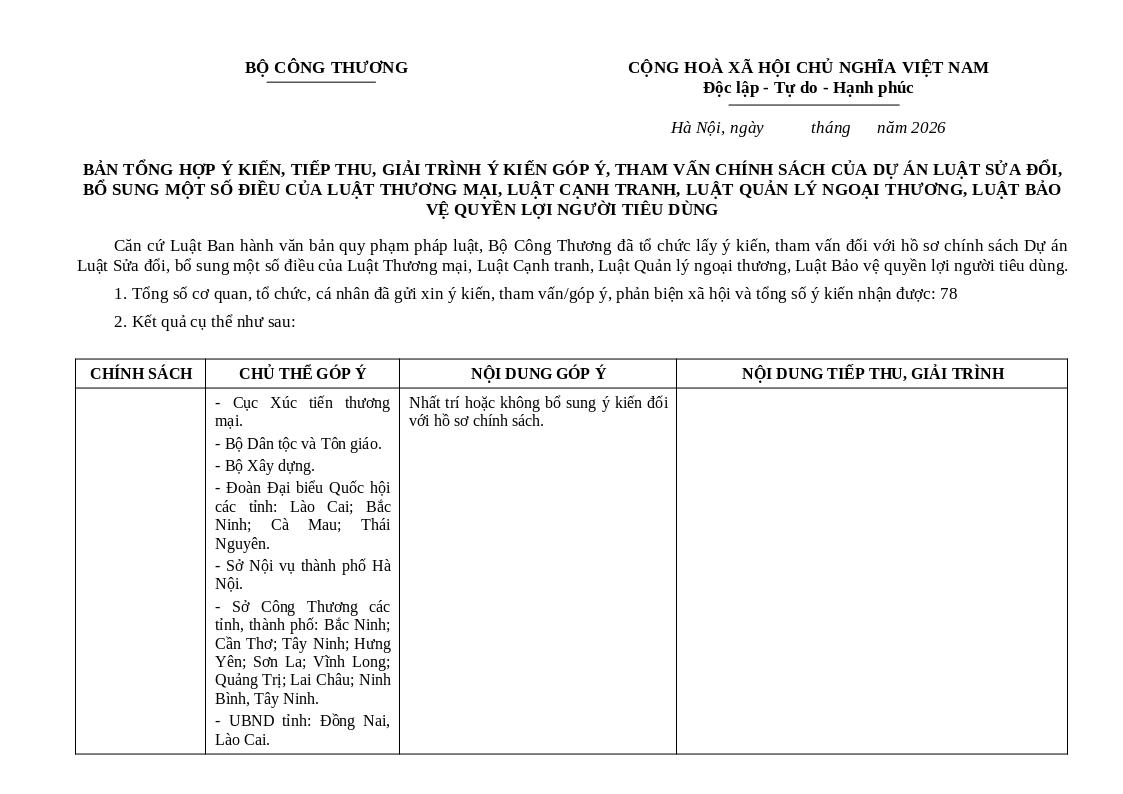 1. Tổng số cơ quan, tổ chức, cá nhân đã gửi xin ý kiến, tham vấn/góp ý, phản biện xã hội và tổng số ý kiến nhận được: 78