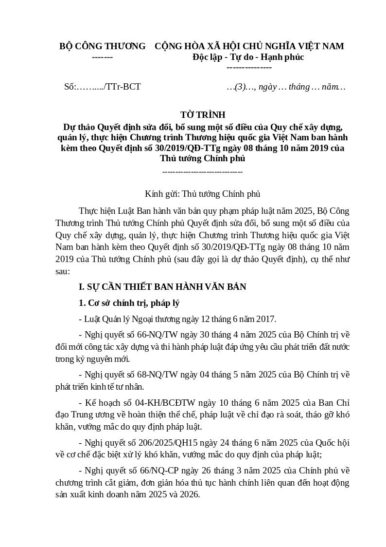 Thực hiện Luật Ban hành văn bản quy phạm pháp luật năm 2025, Bộ Công Thương trình Thủ tướng Chính phủ Quyết định sửa đổi, bổ sung một số điều của Quy chế xây dựng, quản lý, thực hiện Chương trình Thương hiệu quốc gia Việt Nam ban hành kèm theo Quyết định số 30/2019/QĐ-TTg ngày 08 tháng 10 năm 2019 của Thủ tướng Chính phủ (sau đây gọi là dự thảo Quyết định).