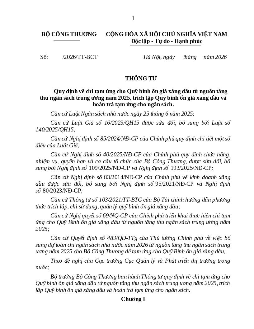 Bộ Công Thương đang xây dựng Dự thảo Thông tư Quy định về chi tạm ứng cho Quỹ bình ổn giá xăng dầu từ nguồn tăng thu ngân sách trung ương năm 2025, trích lập Quỹ bình ổn giá xăng dầu và hoàn trả tạm ứng cho ngân sách.