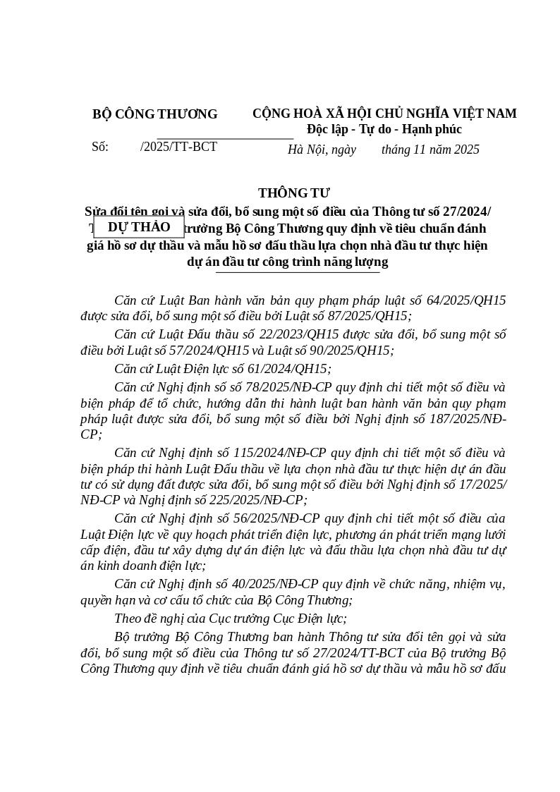 Căn cứ Luật Ban hành văn bản quy phạm pháp luật số 64/2025/QH15 được sửa đổi, bổ sung một số điều bởi Luật số 87/2025/QH15; Căn cứ Luật Đấu thầu số 22/2023/QH15 được sửa đổi, bổ sung một số điều bởi Luật số 57/2024/QH15 và Luật số 90/2025/QH15; Căn cứ Luật Điện lực số 61/2024/QH15;