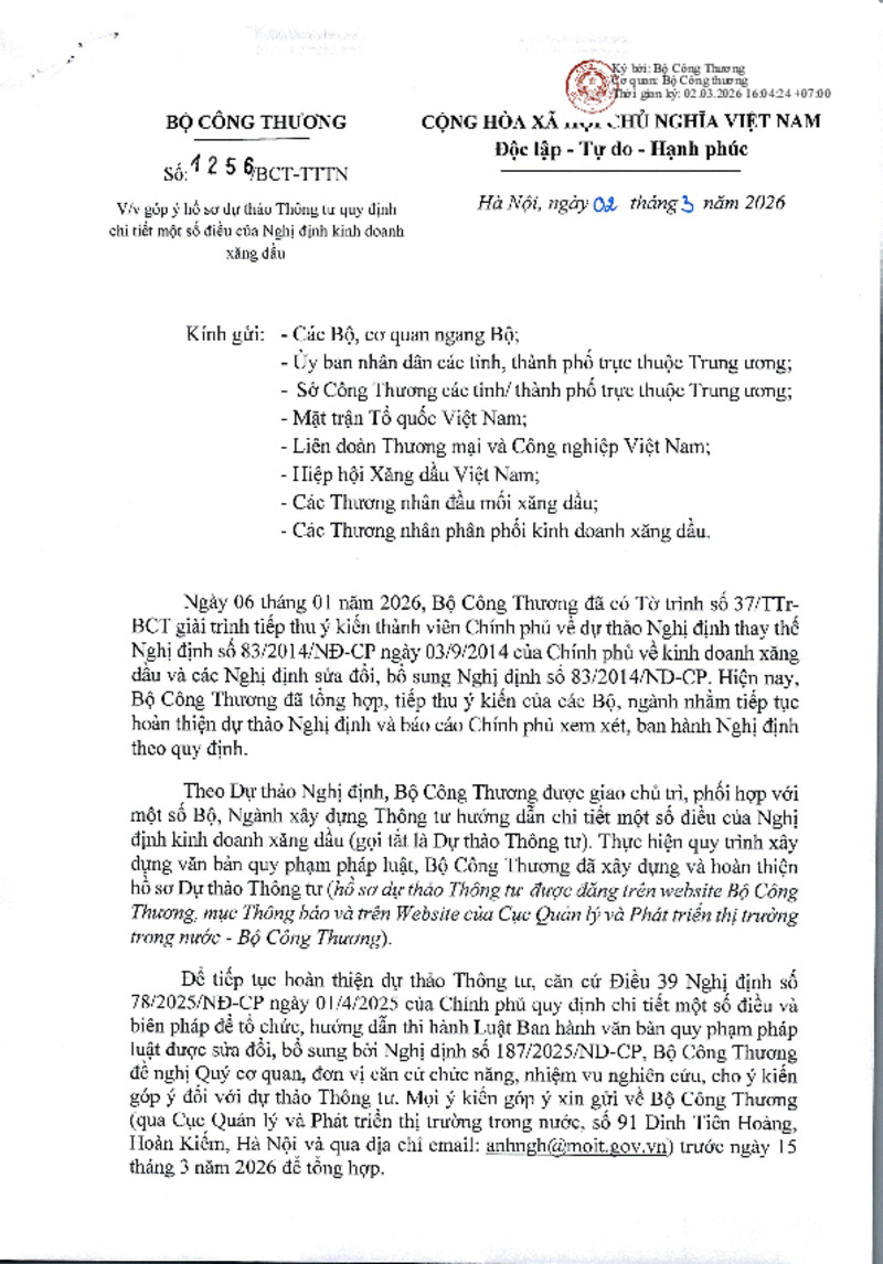 Ngày 06 tháng 01 năm 2026, Bộ Công Thương đã có Tờ trình số 37/TTr-BCT giải trình tiếp thu ý kiến thành viên Chính phủ về dự thảo Nghị định thay thế Nghị định số 83/2014/NĐ-CP ngày 03/9/2014 của Chính phủ về kinh doanh xăng dầu và các Nghị định sửa đổi, bổ sung Nghị định số 83/2014/NĐ-CP. Hiện nay, Bộ Công Thương đã tổng hợp, tiếp thu ý kiến của các Bộ, ngành nhằm tiếp tục hoàn thiện dự thảo Nghị định và báo cáo Chính phủ xem xét, ban hành Nghị định theo quy định.