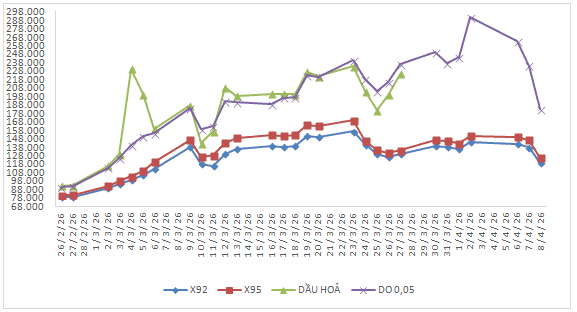 The average global refined petroleum prices between the April 9, 2026 adjustment period and the previous period are as follows: USD 119.460 per barrel of RON92 gasoline used for blending E5RON92 (down USD 20.580 per barrel, equivalent to a decrease of 14.70%); USD 125.820 per barrel of RON95 gasoline (down USD 23.230 per barrel, equivalent to a decrease of 15.59%); USD 183.290 per barrel of diesel 0.05S (down USD 66.215 per barrel, equivalent to a decrease of 26.54%); USD 642.170 per tonne of mazut 180CST 3.5S (down USD 88.530 per tonne, equivalent to a decrease of 12.12%).
