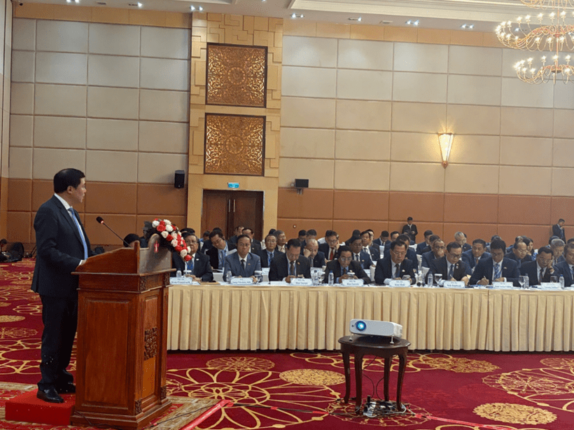 Deputy Minister Nguyen Sinh Nhat Tan presents a report on the current state and future orientation of economic cooperation between Vietnam and Cambodia.