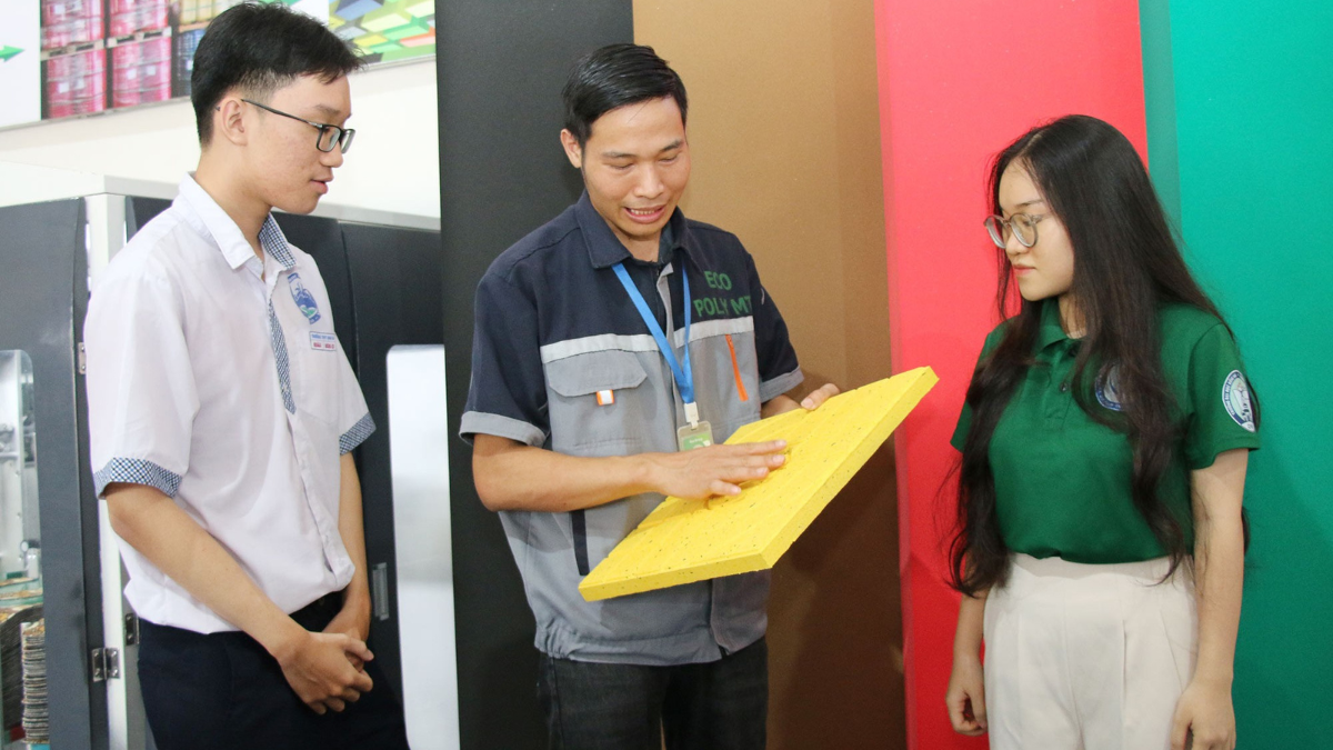 Đại diện Công ty TNHH Chất dẻo thân thiện (Eco Polymers) ở Khu công nghiệp Hố Nai giới thiệu các sản phẩm, vật liệu mới, thân thiện với môi trường của công ty tại Triển lãm Khoa học và công nghệ ở Techfest Dong Nai 2025. Ảnh: Hải Quân