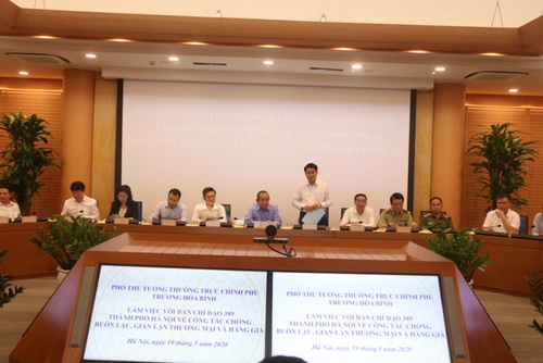 Chiều 19/5/2020, đồng chí Trương Hòa Bình, Ủy viên Bộ Chính trị, Phó Thủ tướng Thường trực Chính phủ, Trưởng Ban chỉ đạo quốc gia chống buôn lậu, gian lận thương mại và hàng giả (Ban Chỉ đạo 389 quốc gia) đã làm việc với Ban Chỉ đạo 389 thành phố Hà Nội về công tác chống buôn lậu, gian lận thương mại và hàng giả, nhất là trong thời gian phòng, chống dịch COVID-19.