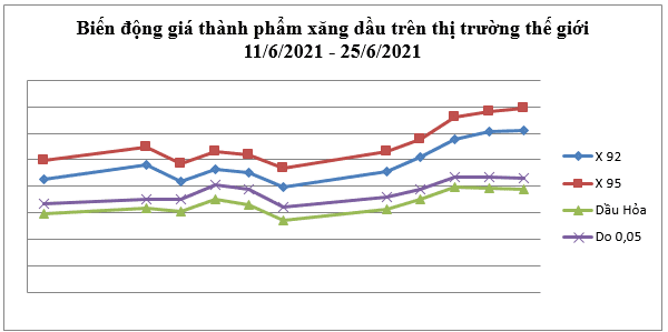 Hoạt động sản xuất, kinh doanh tiếp tục phục hồi sau thời gian chịu ảnh hưởng lớn của dịch bệnh Covid-19 nên nhu cầu sử dụng xăng dầu trên thế giới tăng mạnh đã tác động đến giá xăng dầu thành phẩm tăng trong thời gian vừa qua. Giá xăng dầu thế giới trong 15 ngày vừa qua tăng giảm đan xen nhưng xu hướng chính là tăng cao. Giá bình quân các sản phẩm xăng dầu thế giới trong 15 ngày trước kỳ điều hành giá xăng dầu ngày 26/6/2021 cụ thể như sau: 79,805 USD/thùng xăng RON92 dùng để pha chế xăng E5RON92 (tăng 3,647 USD/thùng, tương đương tăng 4,79% so với kỳ trước); 81,267 USD/thùng xăng RON95 (tăng 3,638 USD/thùng, tương đương tăng 4,69% so với kỳ trước); 77,634 USD/thùng dầu diesel 0.05S (tăng 3,050 USD/thùng, tương đương tăng 4,09% so với kỳ trước); 76,758 USD/thùng dầu hỏa (tăng 2,874 USD/thùng, tương đương tăng 3,89% so với kỳ trước); 415,032 USD/tấn dầu mazut 180CST 3.5S (tăng 19,11 USD/tấn, tương đương tăng 4,83% so với kỳ trước).