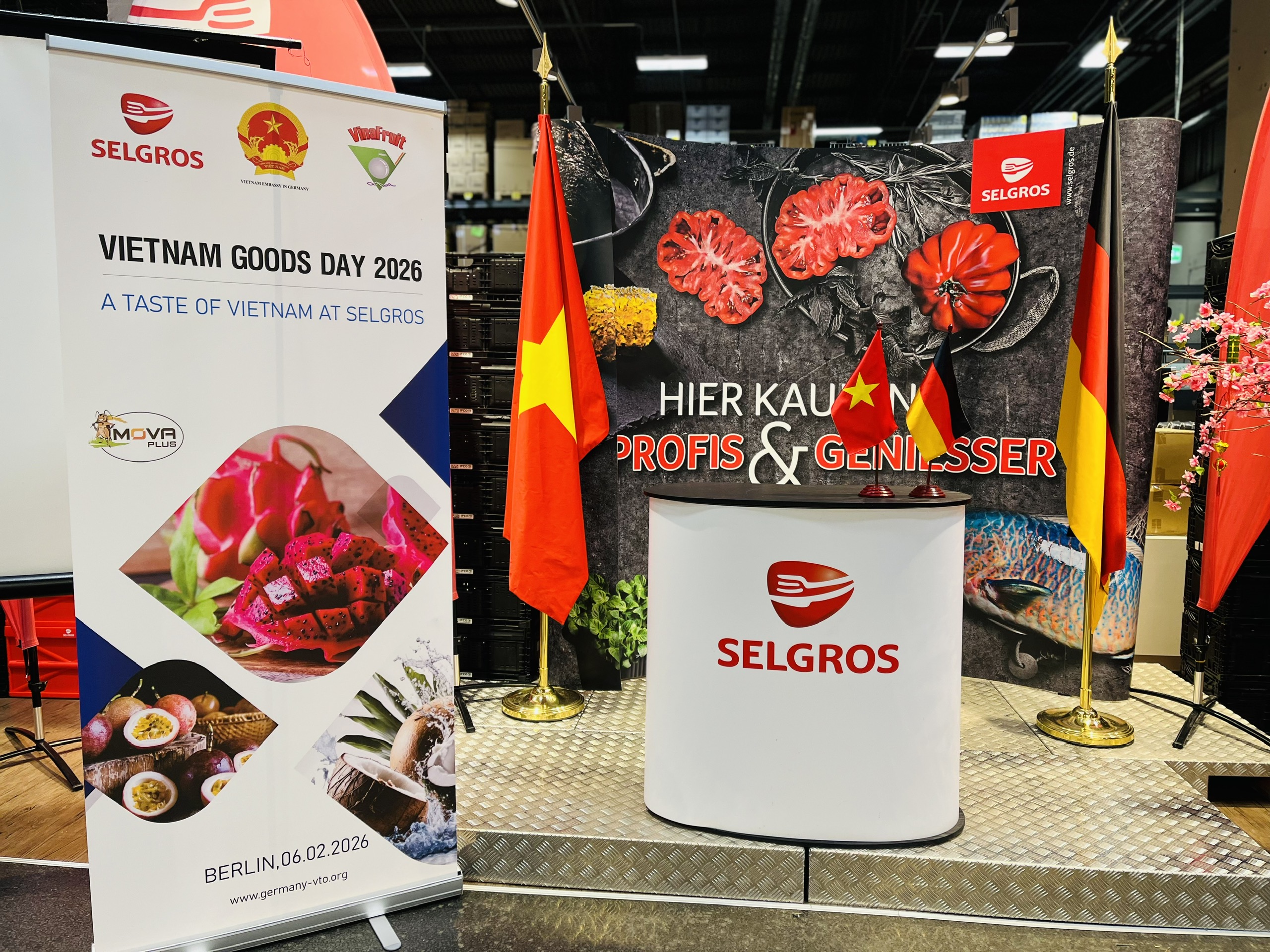 Ngày 6/2/2026, Thương vụ Việt Nam tại CHLB Đức đã phối hợp cùng Hiệp hội Rau quả Việt Nam (Vinafruit) và hệ thống đại siêu thị bán buôn Selgros tổ chức “Ngày hàng Việt Nam” tại siêu thị Selgros Berlin Lichtenberg. Sự kiện nằm trong những chuỗi hoạt động nhằm thúc đẩy xuất khẩu nông sản Việt Nam vào thị trường Đức và diễn ra trong thời gian tổ chức Hội chợ hoa quả quốc tế Fruit Logistica tại Berlin.