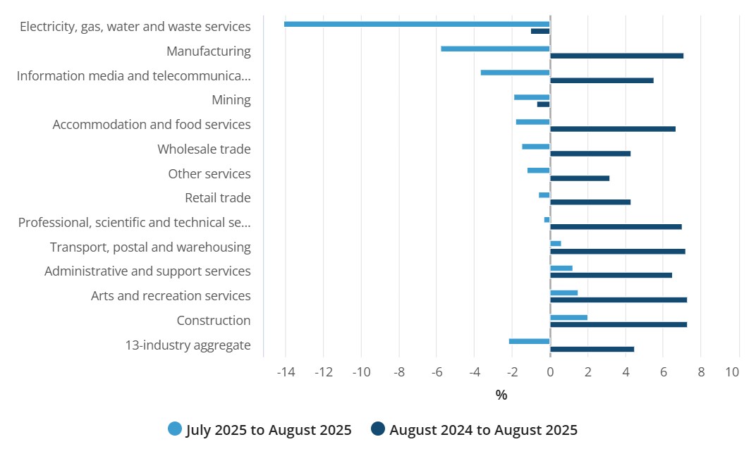 Tăng trưởng doanh số kinh doanh trung bình 13 lĩnh vực ngành nghề kinh tế chủ chốt của Úc trong tháng 8/2025 giảm 2,2% so với tháng trước. Trong đó 9/13 lĩnh vực ghi nhận giảm, nhiều nhất là các lĩnh vực Điện, gas, nước và dịch vụ xử lý rác thải (-14,1%), sản xuất (-5,8%), công nghệ thông tin và truyền thông (-5,3%)… Ngược lại, các lĩnh vực ghi nhận mức tăng tốt có thể kể đến như xây dựng (+2%), dịch vụ nghệ thuật và sáng tạo (+1,5%)…