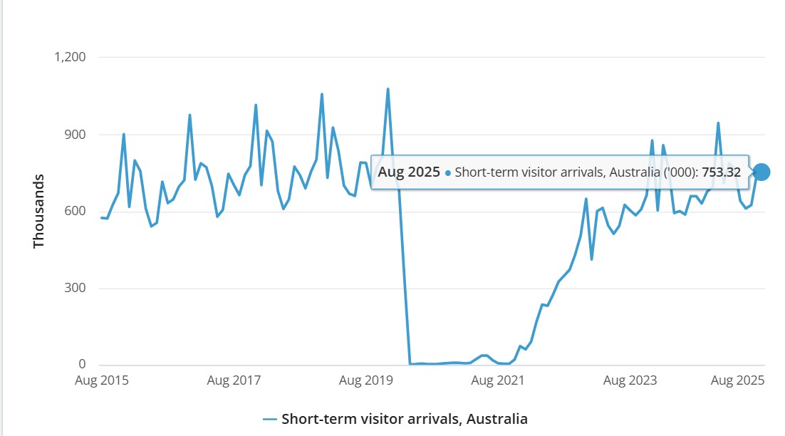 Theo cơ quan Thống kê Úc (ABS), tổng lượt khách từ nước ngoài đến Úc tháng 8/2025 đạt gần 1,8 triệu lượt, tăng 9,3% so với cùng kỳ 2024. Trong số này, công dân Úc trở về nước trong ngắn hạn là 972 nghìn lượt (+6%) và khách quốc tế đến Úc trong ngắn hạn là 753 nghìn lượt (tăng 14,3%).