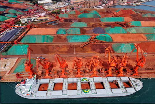 (Tàu chở hàng đang dỡ quặng sắt nhập khẩu tại cảng ở Trung Quốc)
