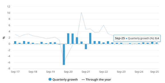 Cơ quan Thống kê Úc (ABS) vừa công bố số liệu kinh tế Úc, theo đó, tăng trưởng GDP quý 3/2025 đạt mức 0,4%; so với cùng kỳ 2024, mức tăng trưởng đạt mức 2,1%.