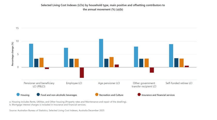 Theo số liệu thống kê của Cục Thống kê Úc (ABS) công bố ngày 04/2/2026, chỉ số sinh hoạt phí (the Living Cost Indexes – LCIs) của quốc gia này đã ghi nhận mức tăng mạnh từ 2,3% lên 4,2% trong năm 2025 tính đến hết Quý IV/2025. Riêng trong Quý IV, chỉ số LCIs đã tăng từ 0,1 lên 0,7%. Trong đó, nhà ở, thực phẩm và dịch vụ giải trí là những yếu tố chính thúc đẩy mức tăng này.