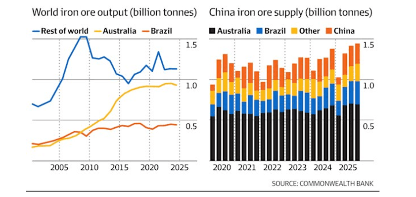 Ngân hàng Commonwealth Bank của Úc đã đưa ra cảnh báo tiêu cực về ngành quặng sắt Úc, cho rằng Trung Quốc sẽ ngày càng giảm phụ thuộc vào nhập khẩu quặng sắt từ Úc nếu nước này sử dụng ưu thế thống trị hiện tại về quặng sắt của mình để gây áp lực dưới sức ép từ Mỹ.