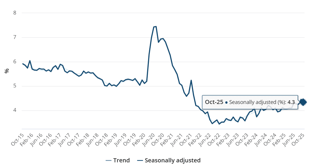 Tỷ lệ thất nghiệp tại Úc trong tháng 10/2025 giảm nhẹ về mức 4,3% (tháng 9/2025 là 4,5%) trong đó, số người có việc làm đạt xấp xỉ 14,7 triệu, tăng 232 nghìn người (+1,6%) so với cùng kỳ 2024; số người thất nghiệp hơn 665 nghìn, tăng 48,3 nghìn người so với cùng kỳ 2024, tương đương mức tăng 7,8%.