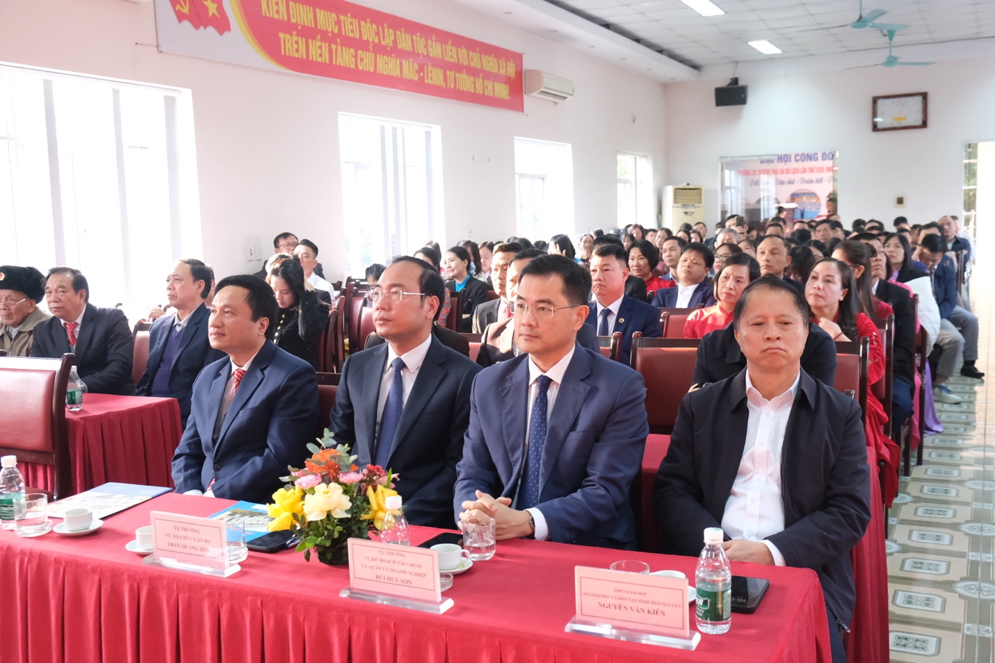 Vụ trưởng Vụ Tổ chức cán bộ Trần Quang Huy và Vụ trưởng Vụ Kế hoạch, Tài chính và Quản lý doanh nghiệp Bùi Huy Sơn chúc mừng ban lãnh đạo của Nhà Trường