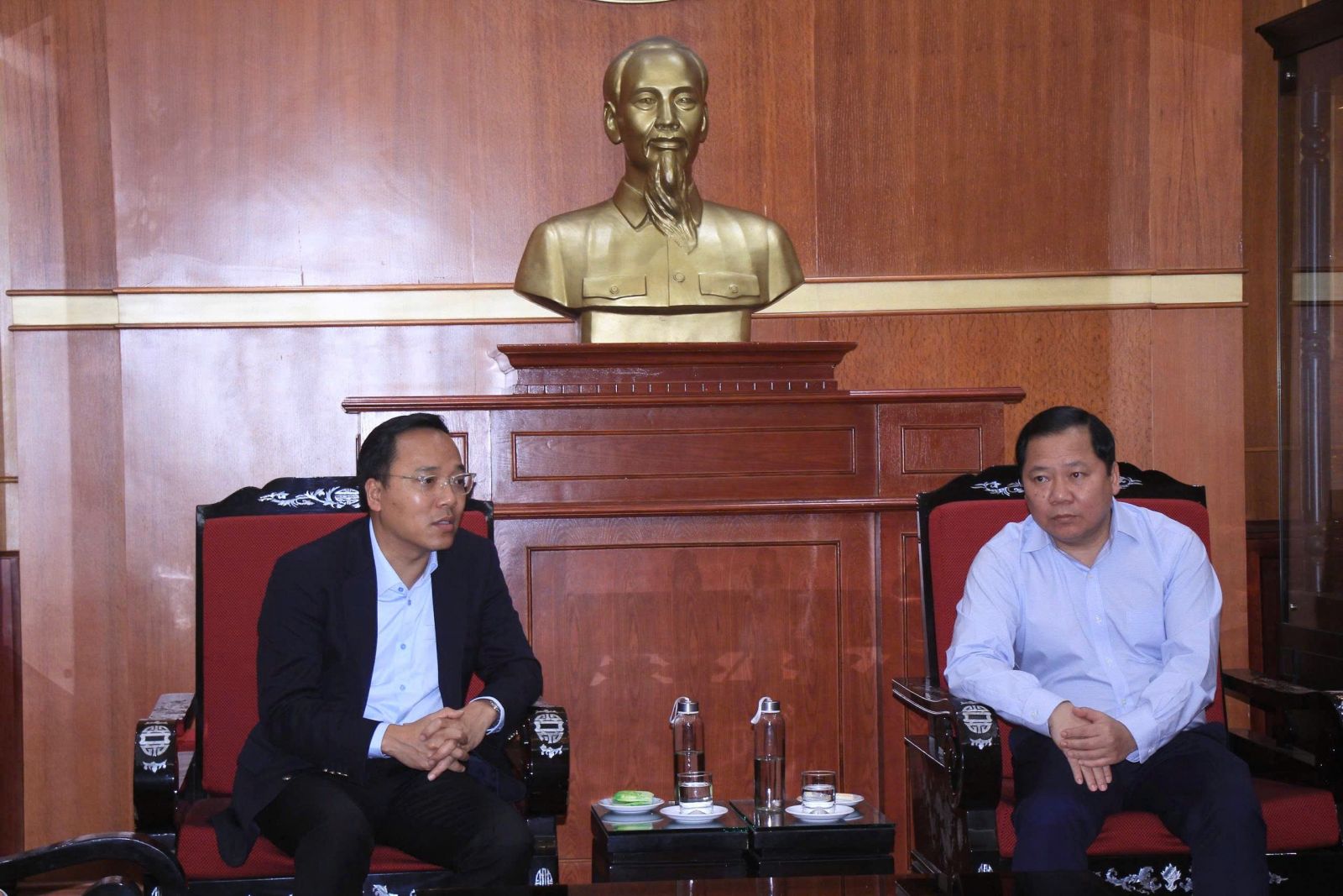 Thứ trưởng Bộ Công Thương Nguyễn Hoàng Long trao đổi với ông Nguyễn Phi Long, Uỷ viên dự khuyết Ban Chấp hành Trung ương Đảng, Phó Bí thư Đảng uỷ Mặt trận Tổ quốc, các đoàn thể Trung ương về chương trình ủng hộ đồng bào vùng lũ mà Bộ Công Thương đã thực hiện. Ảnh: Phương Cúc